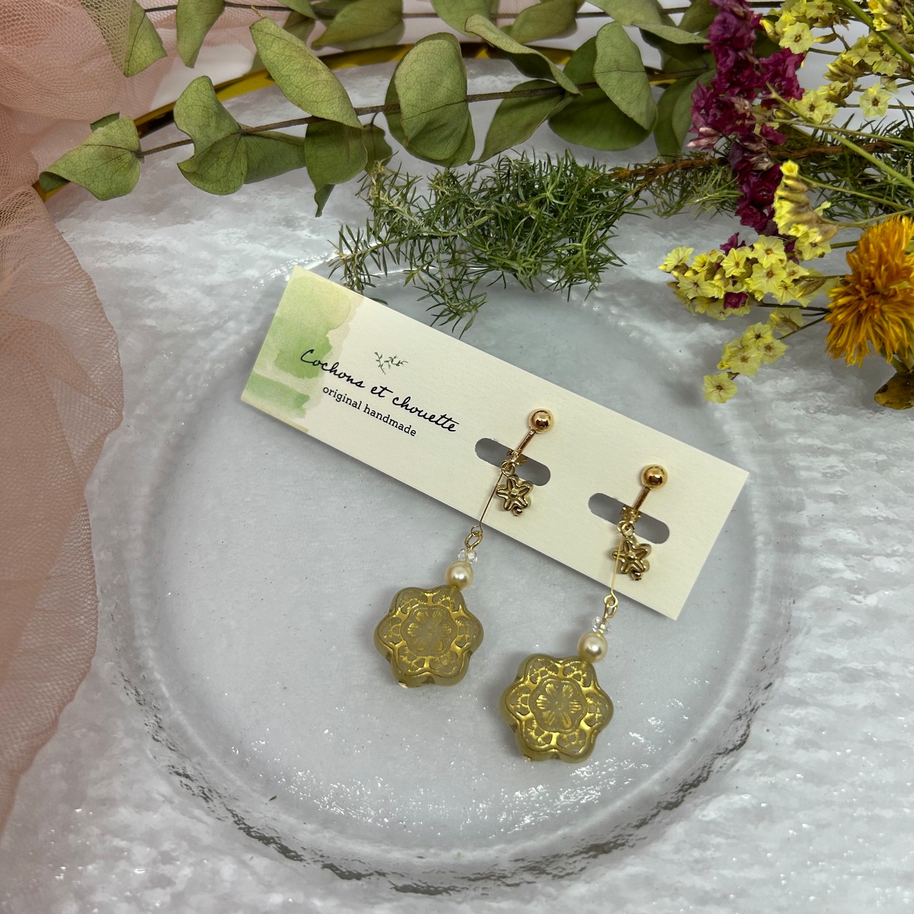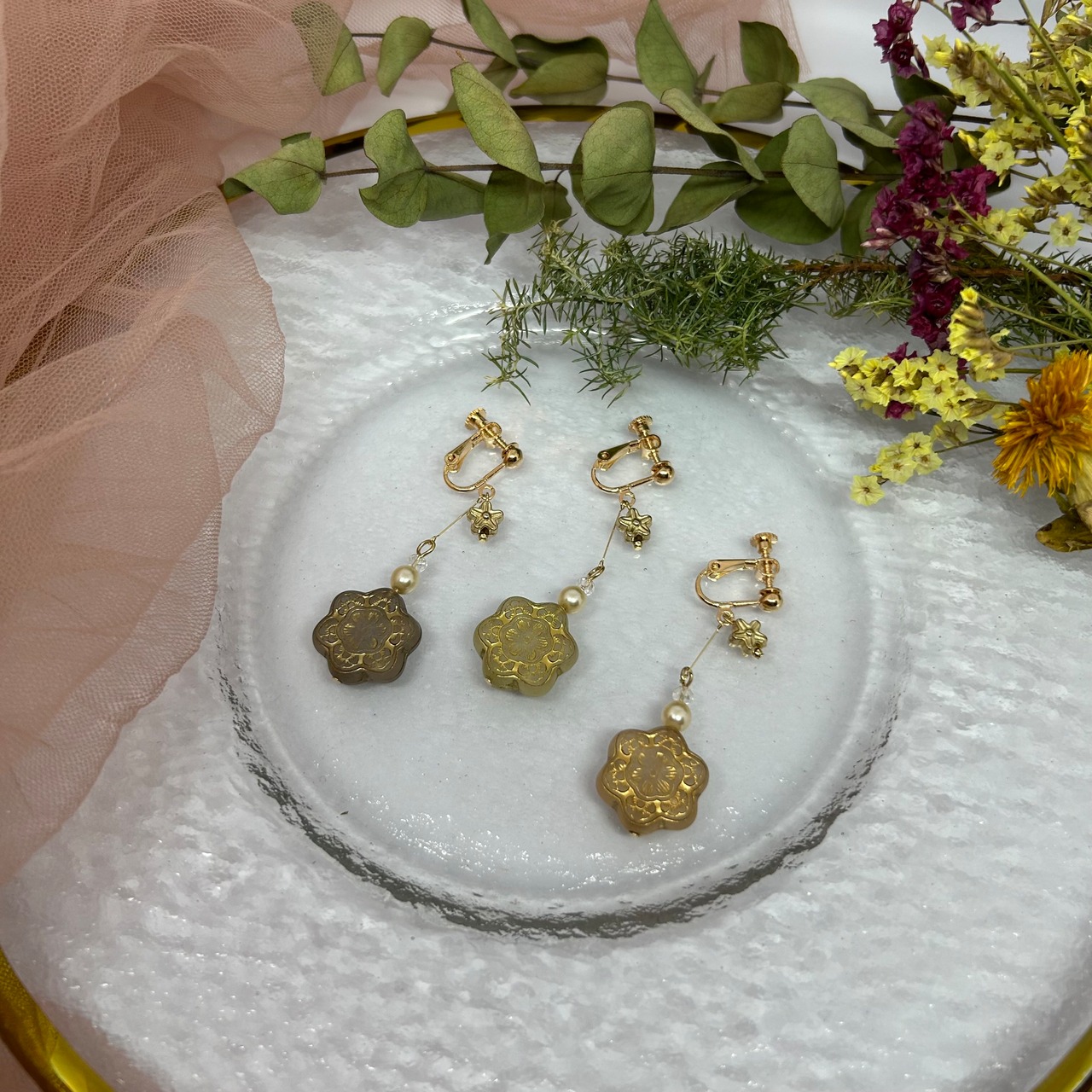 お花モチーフのアンティークビーズを使って可愛らしい中にも大人っぽさを出してみました!