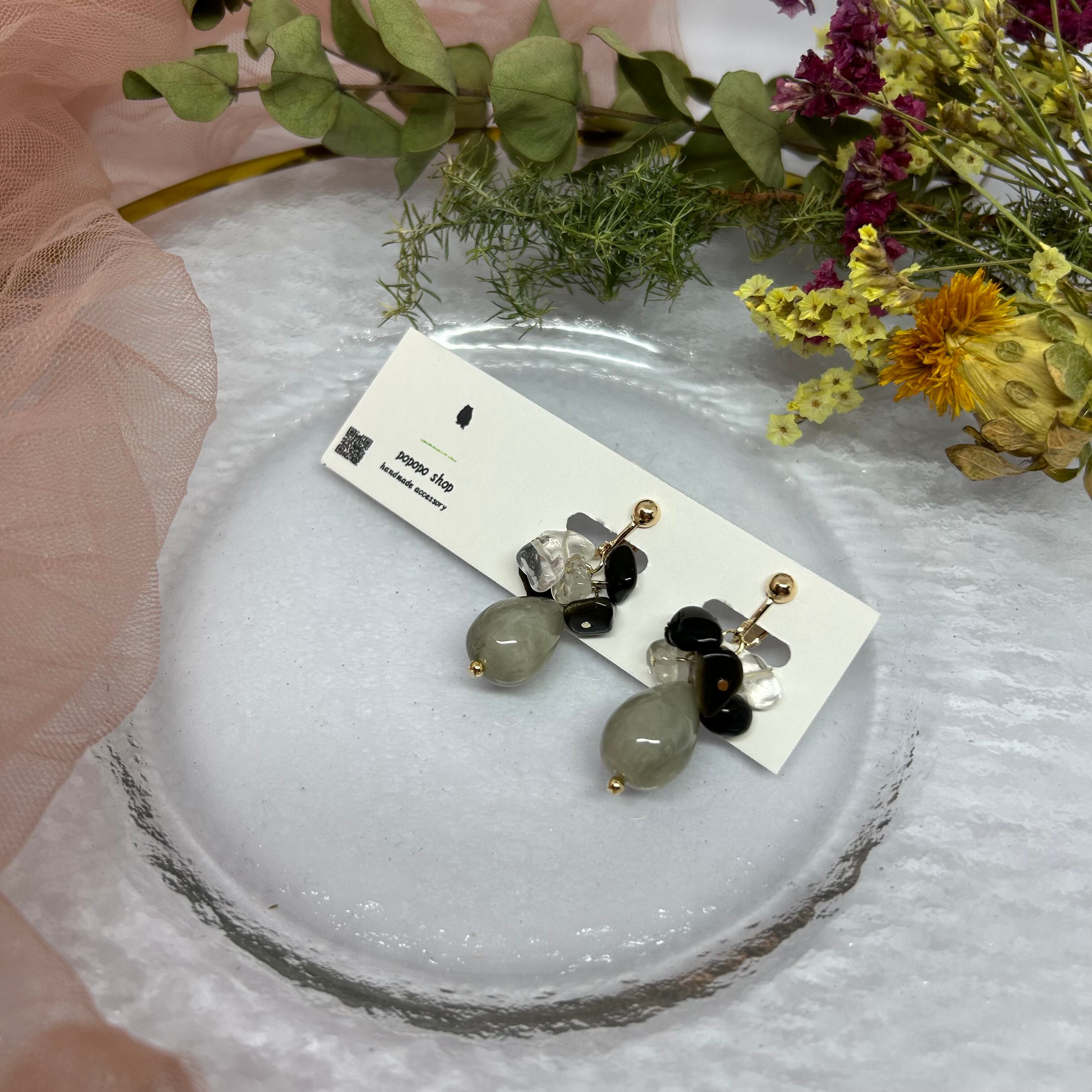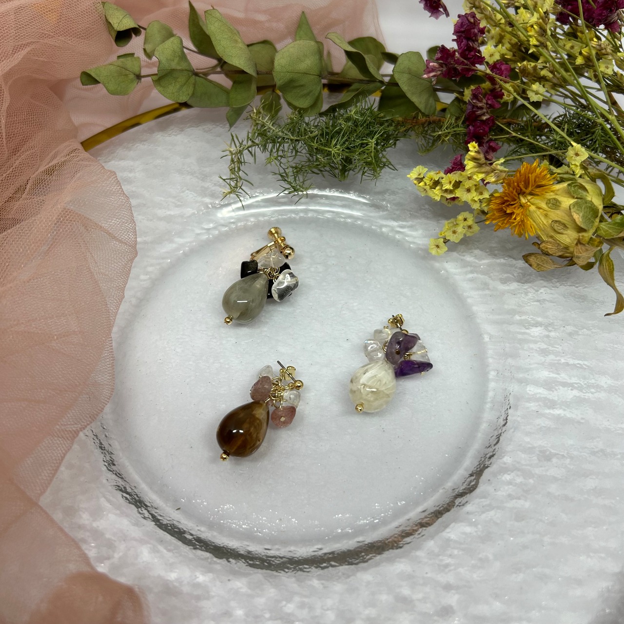 しずく型のガラスビーズに天然石のさざれ石を合わせたデザインです!